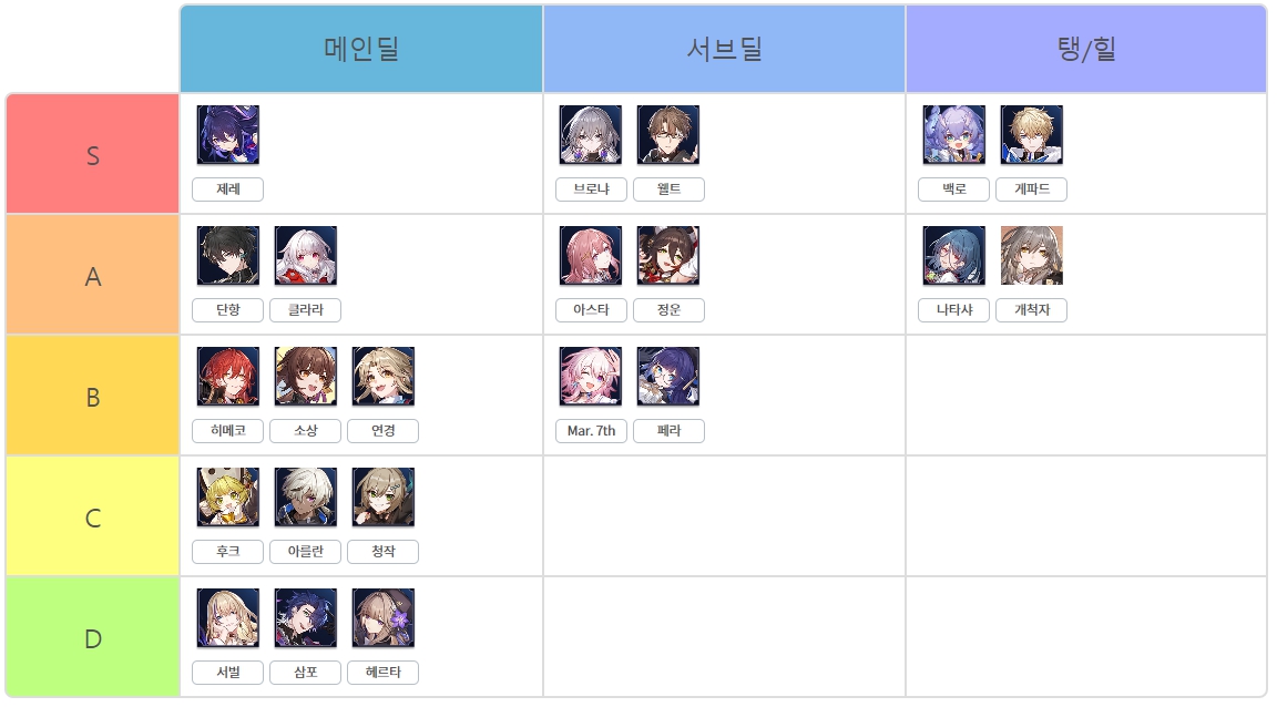 붕괴 스타레일 1.0 등급표 티어